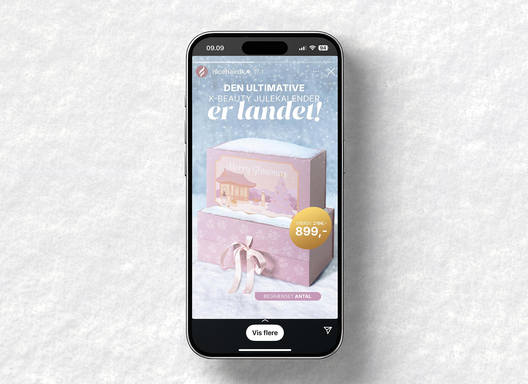 Opslaget er lavet for at skabe opmærksomhed om Nicehair K-beauty Julekalender 2025 på sociale medier. Designet er enkelt, visuelt og målrettet, så det fanger køberens interesse med det samme. Opslaget viser produktet på en inspirerende måde og inviterer brugeren til at udforske julekalenderen nærmere.